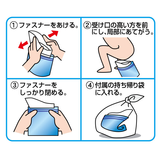 オシッコをすばやく固め臭いを包む、携帯トイレです。 小さくコンパクトに折りたためるので携帯に便利です。 受け口が発泡体で適度な硬さがあり使いやすい形状です。 蓄尿袋はポリエチレンと不織布の複合フィルムで肌に優しく強度もあり安心です。 ファスナー付きで使用後密封できます。 容量600ml。安心の日本製です。