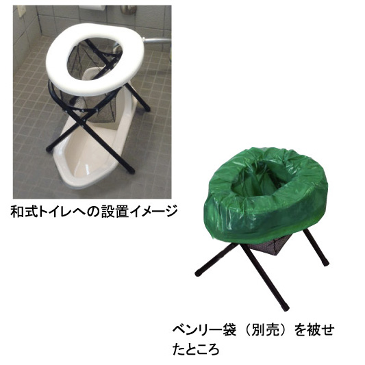 災害時、アウトドア等、屋外、室内、どこにでも手軽に設置できる組立式スチールトイレです。ベンリー袋と合わせて使うことで、便・尿を凝固剤で処理できます(別売) 。便座をスタンドにはめ込むだけの簡単組立。折りたたみ式で保管時収納スペースをとりません。断水時、和式トイレにもセットして使えます。