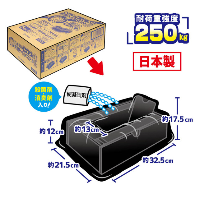 ●大小可能!しかも車内等の狭い空間で! ●水分をゼリー状に固め、臭いがあまり気にならない! ●大人からこども、男女と幅広く使用可!   ●組立て超簡単!煩わしい便器の組立て作業が楽に! ●頑丈!耐荷重強度250kg! ●便器は繰り返し使える! ●収納時21.5×32cmのコンパクト設計! ●凝固剤は食添用殺菌剤・消臭剤入り! ●チャック付きの密封袋付!  ●うれしい!水溶性ティッシュ2個付! ●便器本体は段ボール製で、処分が簡単!   ●車内はもちろん、災害時、アウトドア等幅広く使える!