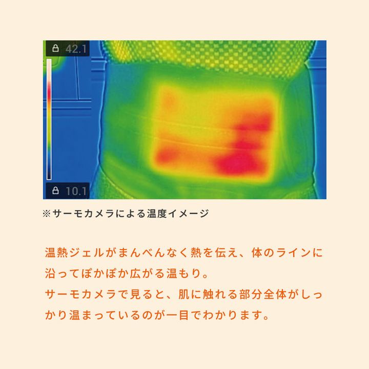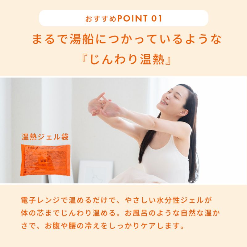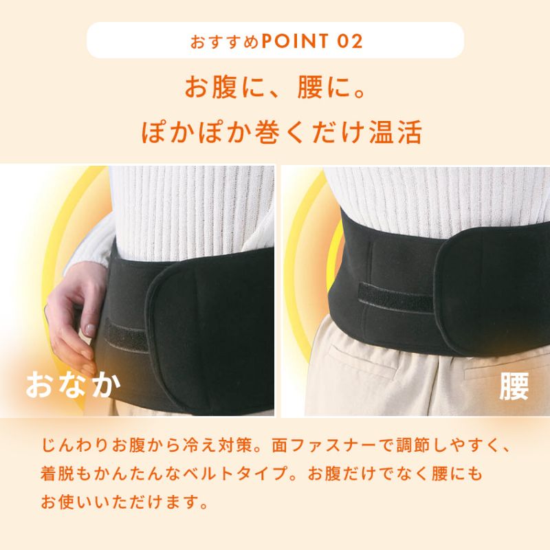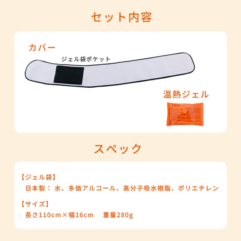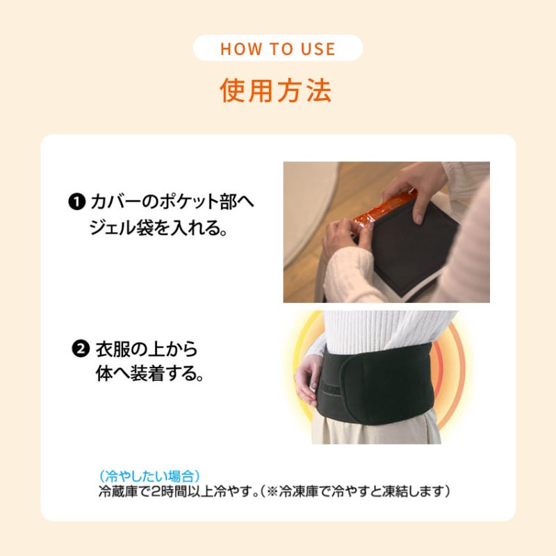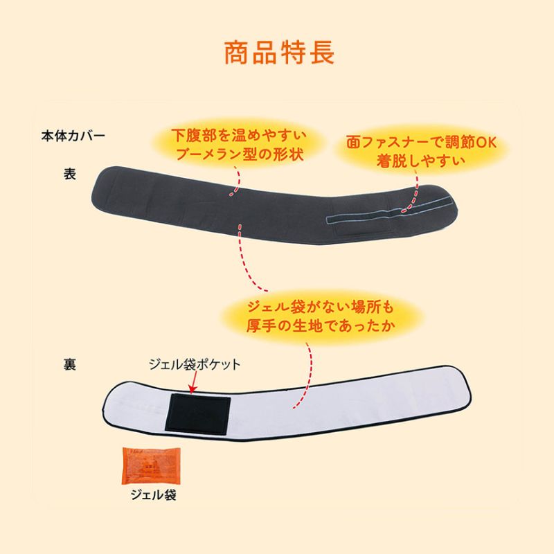・温熱ジェル袋でおなかを心地よく温めます。 ・下腹部を温めやすい形状です。 ・ベルトタイプのカバーのため、着脱が簡単です。 ・面ファスナーで調節が可能です。(約60~100cm) ・電子レンジで短時間の加熱で繰り返し使え経済的です。 ・腰を温めるのにも使えます。 ・冷やしても使えます。