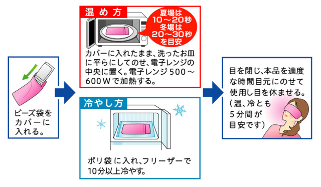 商品説明: 目元に蒸気の心地よい温かさや、スッキリとした冷たさを与えてくれます。 温かさは電子レンジで約20~30秒の加熱、冷たさはフリーザーで約10分冷やすことが目安です。 温めた保湿ビーズが温かい蒸気を発散し、目に適度な温感を与えます。冷えたビーズが目にフリーザーの冷たさを優しく与えます。 タオル生地のカバーは肌に良くなじみ、蒸気による水分のべたつき感を防ぎます。繰り返し使用できお得です。